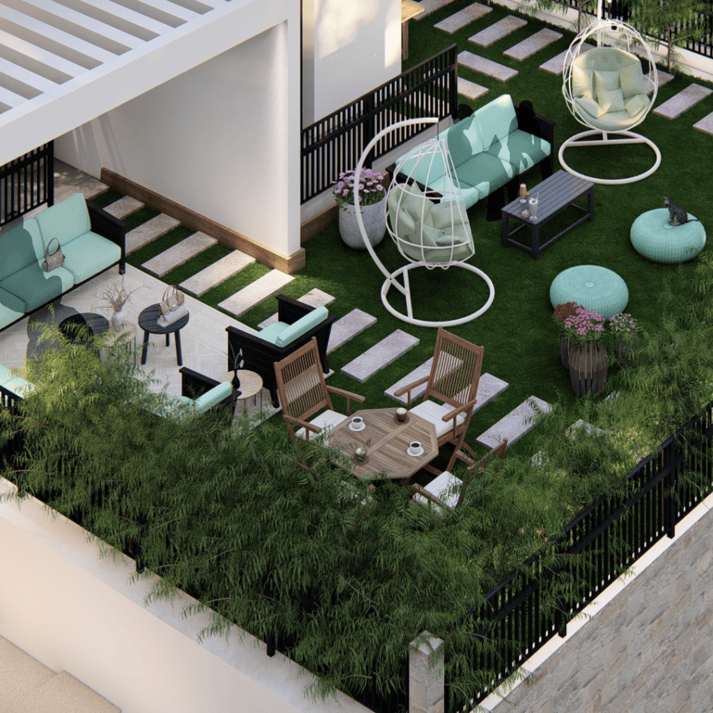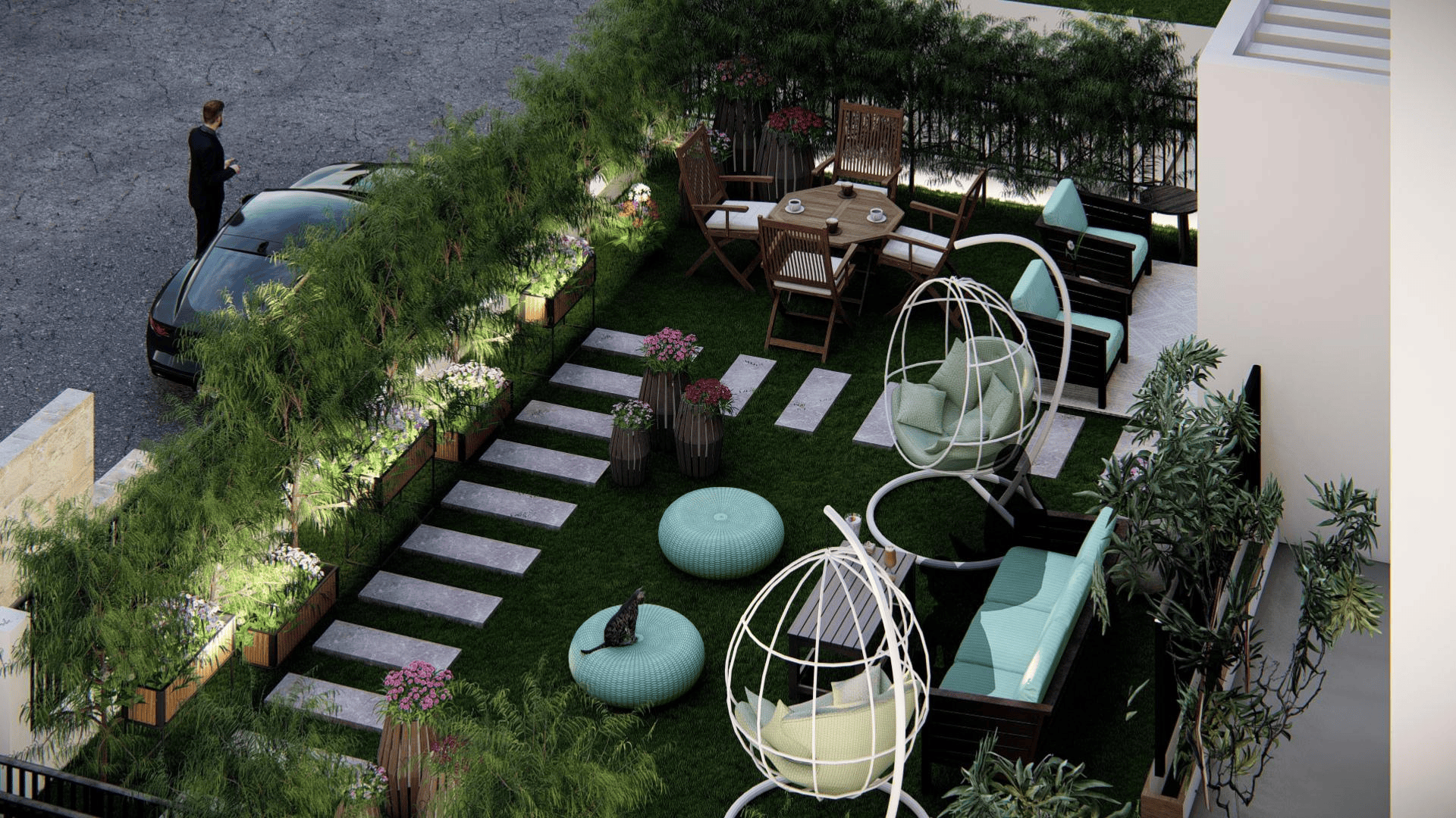 This rooftop design transforms a simple upper level into a luxurious outdoor retreat. Surrounded by lush greenery and thoughtfully placed furniture, the space invites calm, connection, and comfort high above the street.