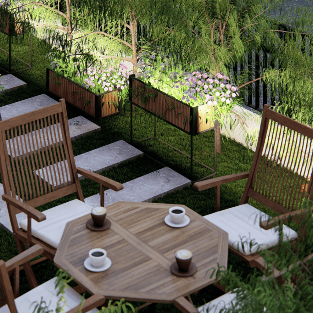 Subtle lighting accents along the garden beds and seating areas create a serene atmosphere for evenings. Whether it’s a quiet sunset or a vibrant gathering, the space remains warm and welcoming after dark.