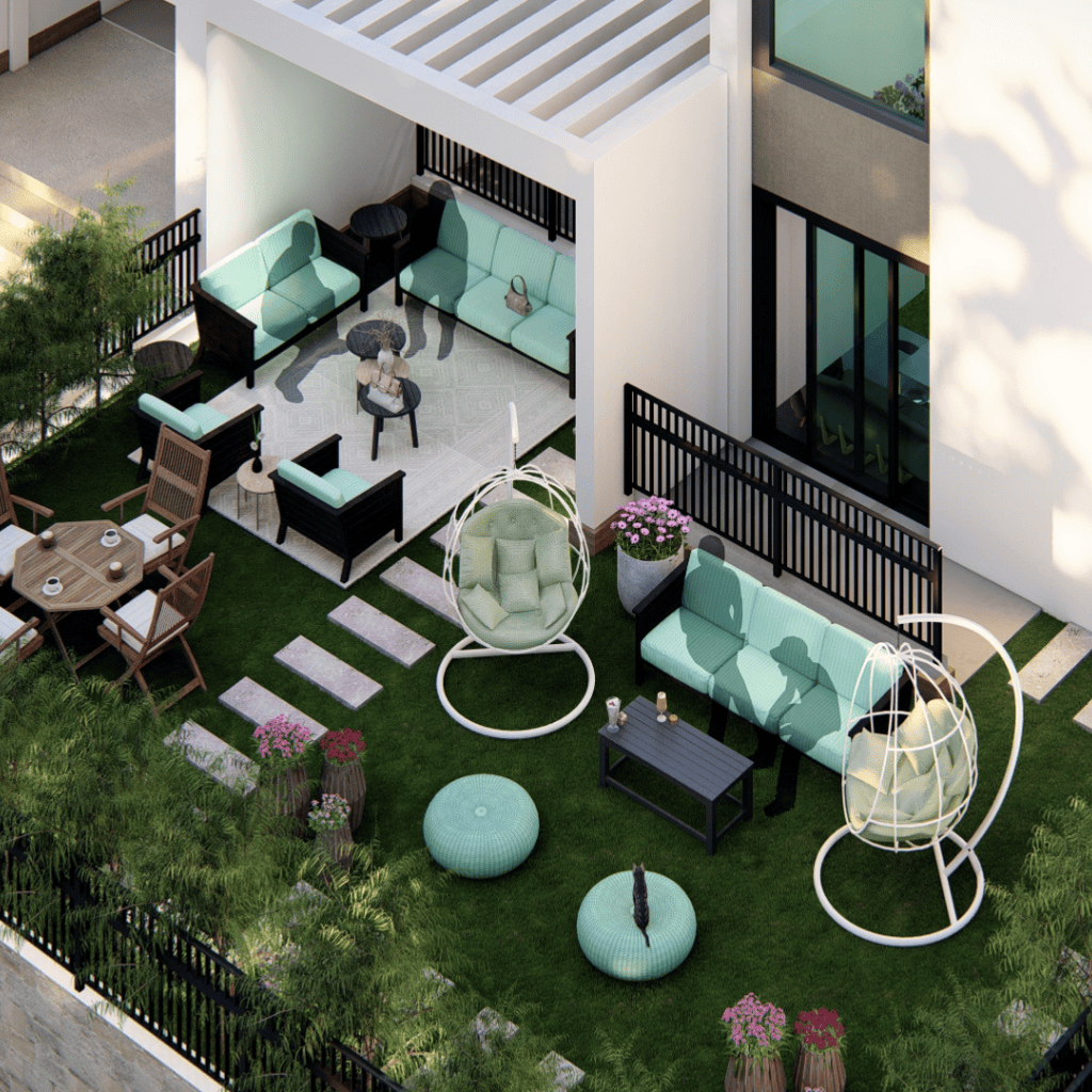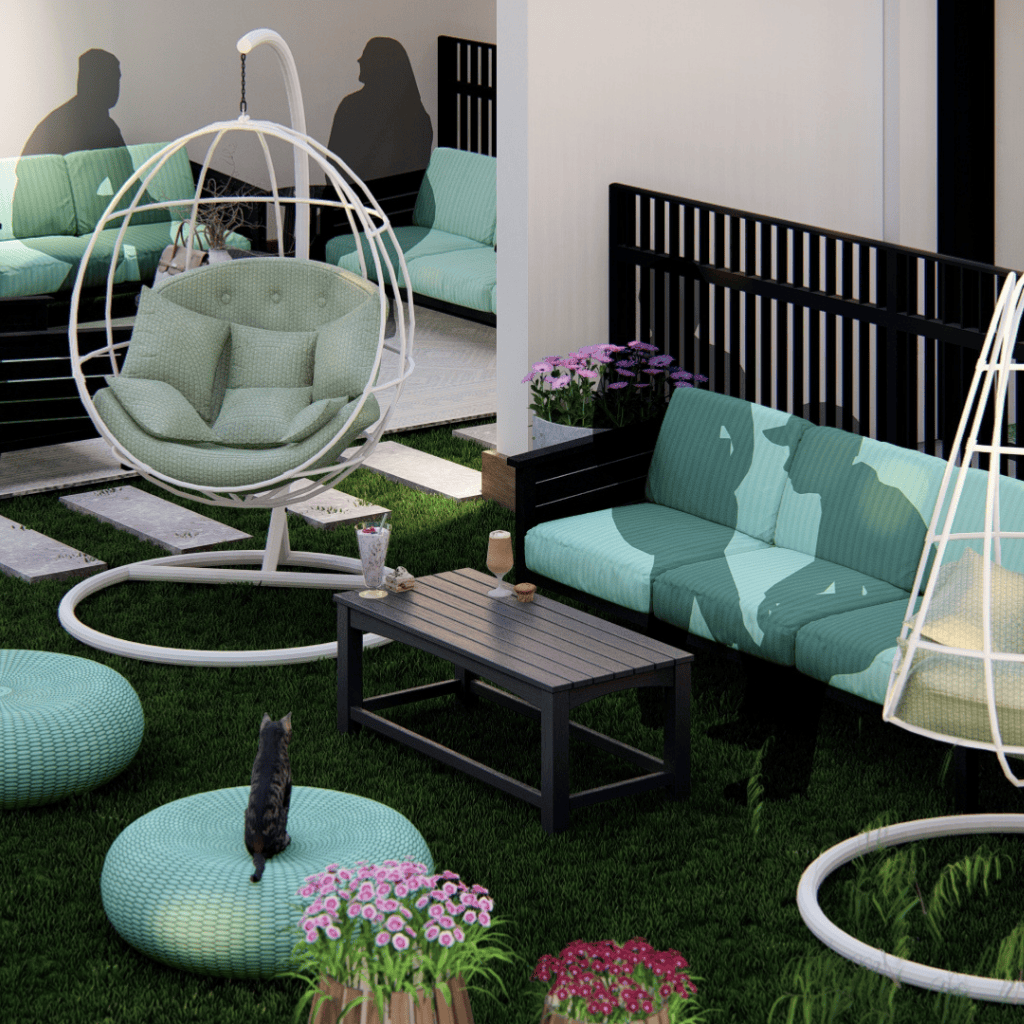 Multiple seating zones are arranged for different moments – from cozy coffee chats to lively gatherings. The layout includes lounge chairs, circular hanging pods, and a wooden dining set that encourages community and ease.
